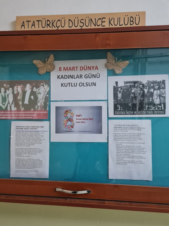 OKUL İDAREMİZ, 8 MART DÜNYA KADINLAR GÜNÜ MÜNASEBETİYLE, OKULUMUZDAKİ BAYAN ÖĞRETMENLERE ÇİÇEK VE PASTA İKRAM EDEREK GÜNLERİNİ KUTLADI. BAYAN ÖĞRETMENLERİMİZİN ONORE EDİLMESİ, GÜNÜ ŞENLİK HAVASINA DÖNÜŞTÜRDÜ. KONFERANS SALONUMUZDA ÖĞRENCİLERİMİZE SEMİNER VERİLDİ. PANO ÇALIŞMALARI YAPILDI. HER KADIN HEM ANNE HEM EVLATTIR. HEM DE TOPLUMUN YAPI TAŞLARINDANDIR. İYİ Kİ VARSINIZ!