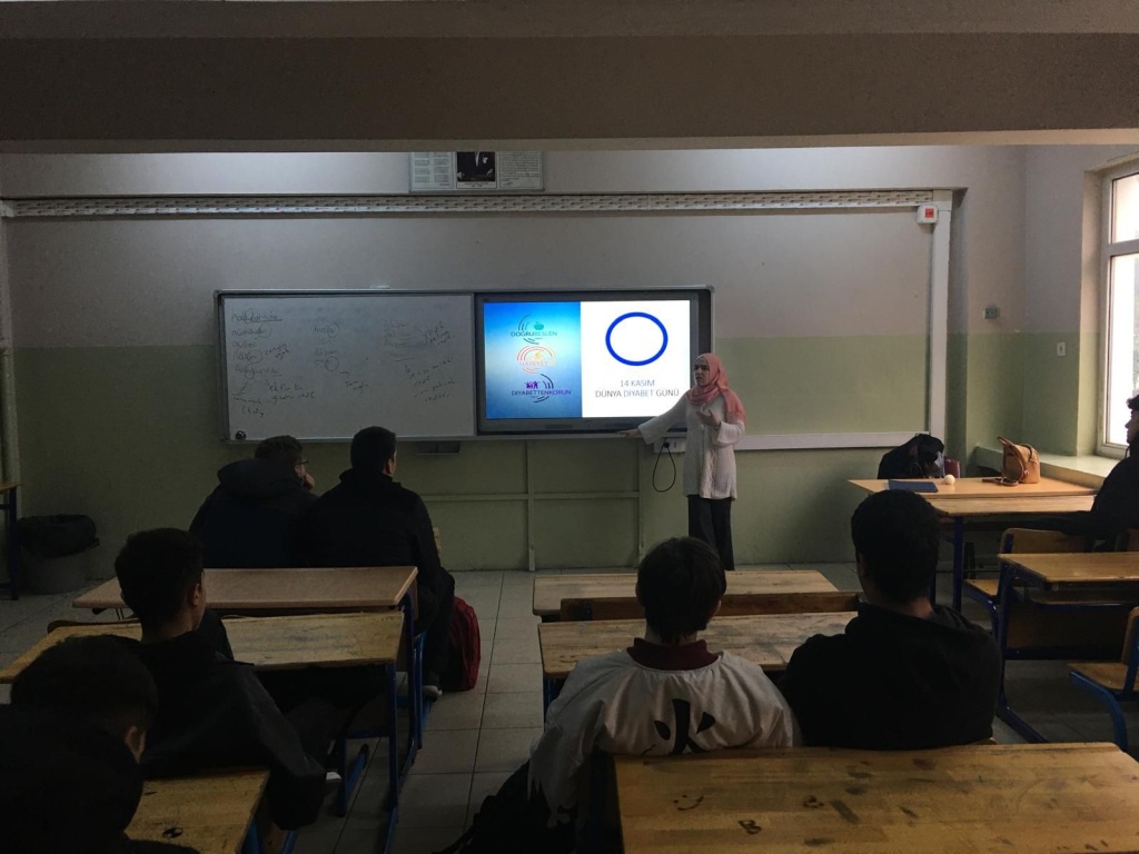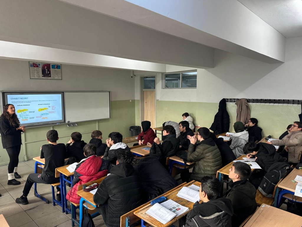 BİYOLOJİ DERSİ ÖĞRETMENLERİMİZ GÖZDE TOPRAKÇI VE MELİKE DOMANİÇ, 9. VE 10. SINIFLARDA DİYABETİ ANLATAN SUNUMLAR YAPTILAR. GİDEREK YAYGINLAŞAN BU HASTALIĞA DİKKAT ÇEKTİLER.
